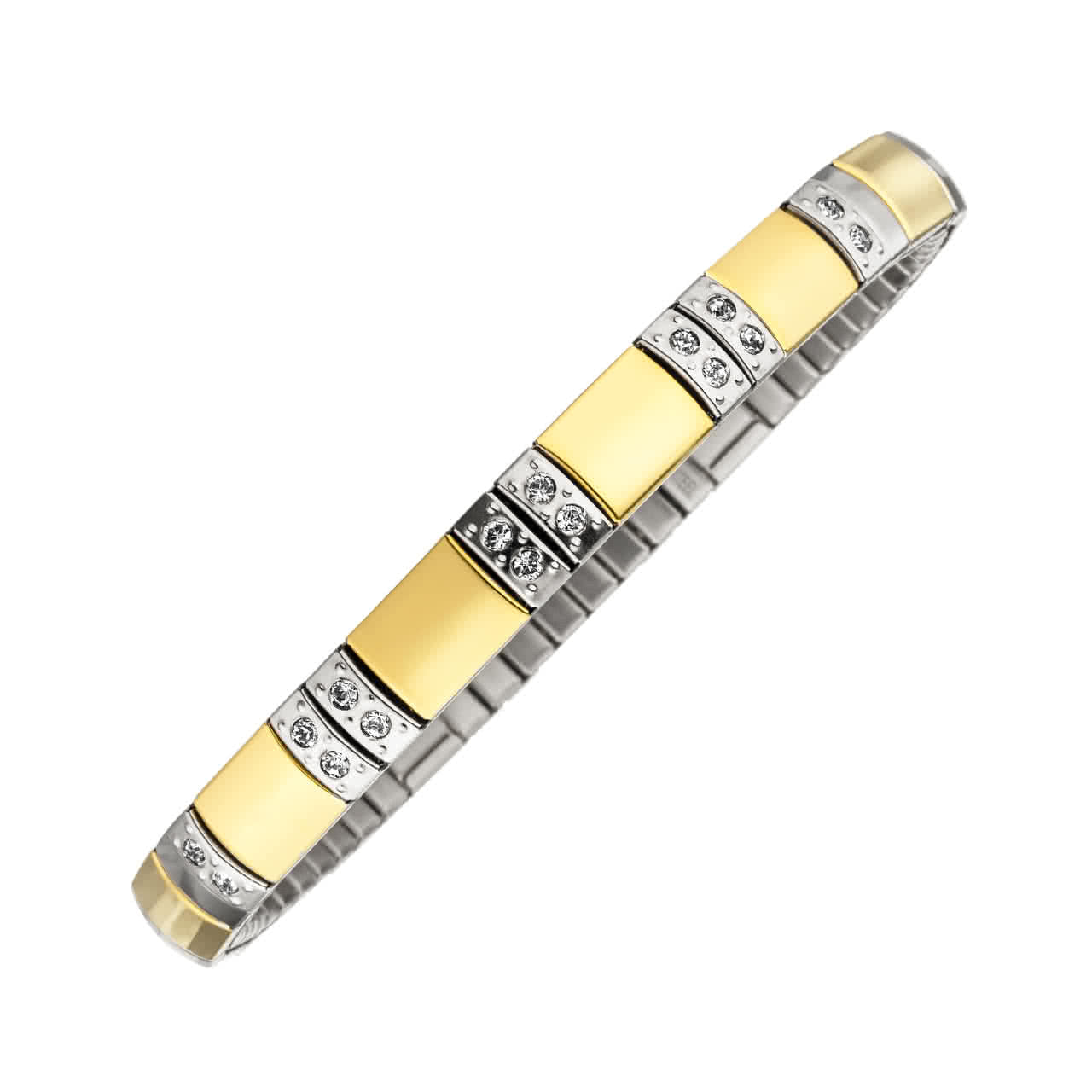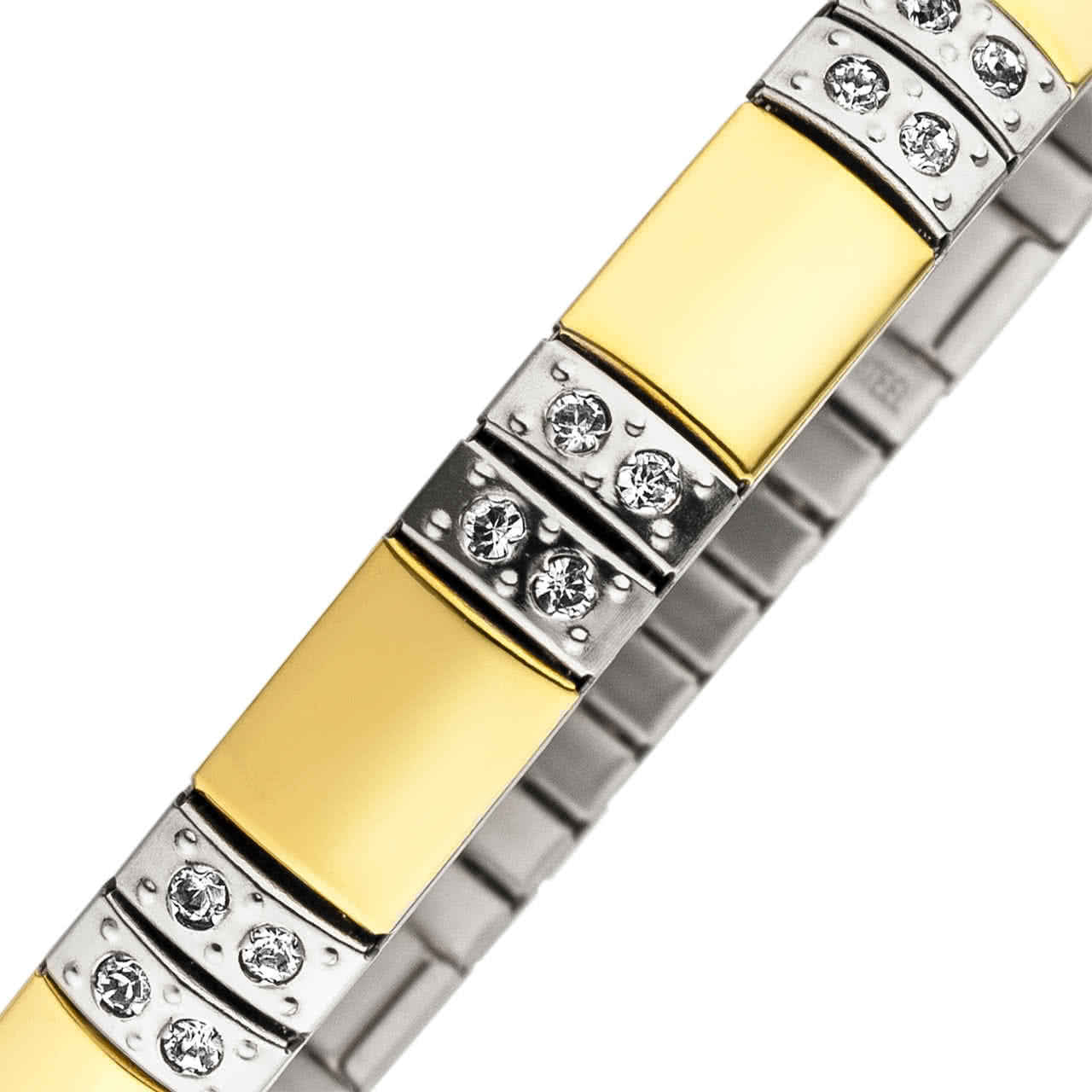 Edel & chic: Das flexible Magnetarmband in Bicolor ist mit unzähligen Kristallsteinen versehen. Dadurch ist es perfekt für die Kombination mit Schmuckstücken in Gold, Edelstahl & Silber. Das Magnetarmband punktet auch durch praktischen Details: